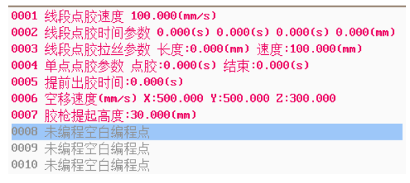 菜單1為點(diǎn)膠動作編程和常用的點(diǎn)膠文件操作,菜單1所生成的編程點(diǎn)通常是點(diǎn)膠操作類,用黑色顯示。菜單1包括以下內(nèi)容: