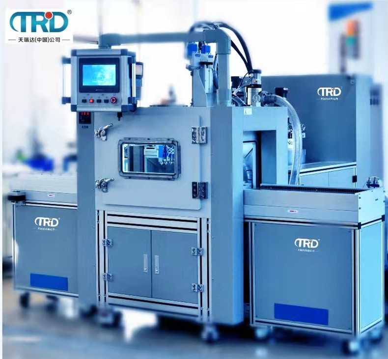 一,真空灌膠機(jī)的優(yōu)勢:然而它的使用基本不受外界環(huán)境所干擾,所以設(shè)備性能穩(wěn)定,注膠精度 高,運(yùn)行可靠。而正是由于這些特性,相比在常壓下灌注,膠水貼度過高氣泡極難消除,產(chǎn)品內(nèi)部有 氣泡膠水極難滲透,而導(dǎo)致灌出來的產(chǎn)品表面凹凸不平,性能更是相差甚遠(yuǎn)。此時(shí)真空灌膠機(jī)的作用則可以體現(xiàn)出來,真空灌膠機(jī)是保持在絕對負(fù)壓狀態(tài)下對產(chǎn)品進(jìn)行3-4次灌注的作業(yè)方式,利用負(fù)壓的作用力,在灌注過程中先將真空箱體內(nèi)的空氣抽走,再進(jìn)行產(chǎn)品灌注,能快速將膠水滲入到產(chǎn)品內(nèi)部,灌注沖擊及膠水跟產(chǎn)品接觸產(chǎn)生的氣泡在負(fù)壓作用下也能快速抽走,從而保證產(chǎn)品的高性能。